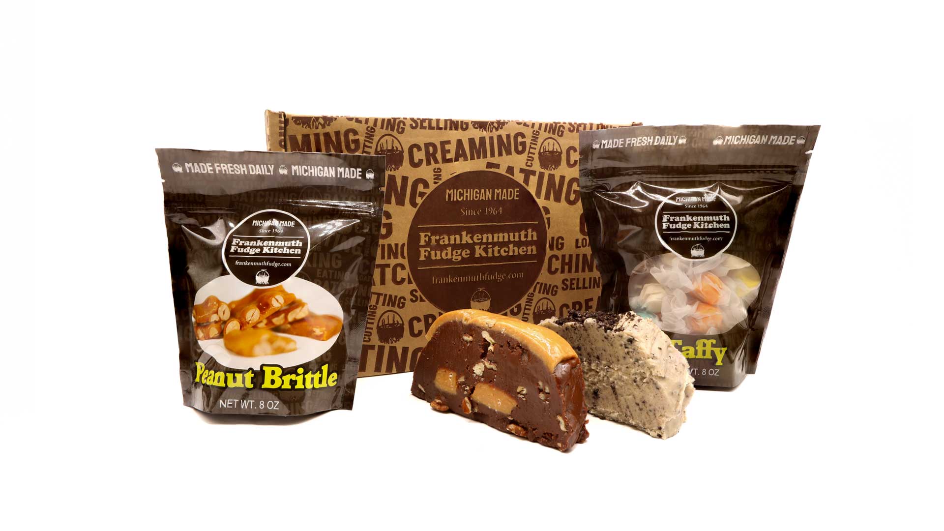 Indulge in a sweet experience with our Taster Gift Box, featuring a delectable selection of Michigan's finest confections. Choose two of our rich, creamy Frankenmuth Fudge flavors, each made with our cherished original recipe from 1964. Handcrafted in small batches right here in Michigan, our fudge embodies the perfect blend of tradition and quality.